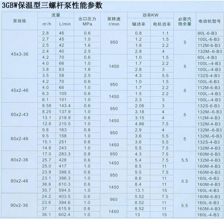 3GBW保溫型三螺桿泵適用于輸送各種無腐蝕性油類殛類似油的液體,輸送液體的粘度一般為3.0~760mm2/s。高粘度介質(zhì)可通過加溫降粘后輸送,其溫度一般不超過350℃。